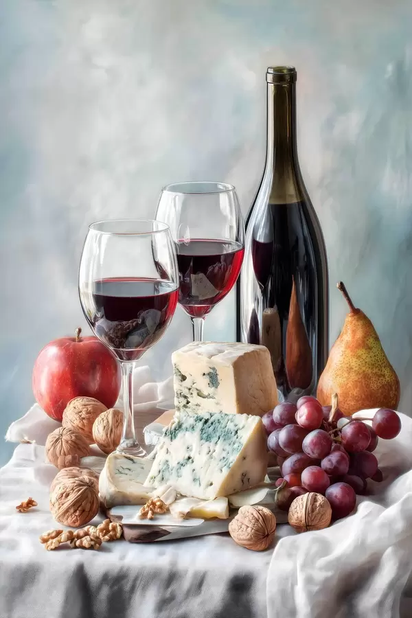 Poster stilleven met wijn, kaas en noten Nr f47686