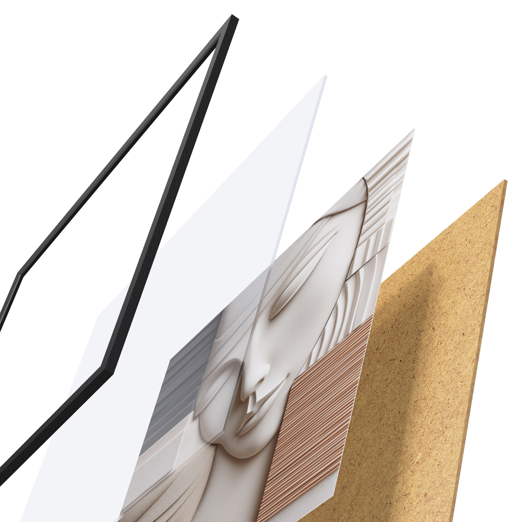 De poster bestaat uit een frame, plexiglas, geprinte afbeelding en spaanplaat achterkant. De poster kan meteen aan de muur worden gehangen dankzij de bevestigingen op de achterkant.