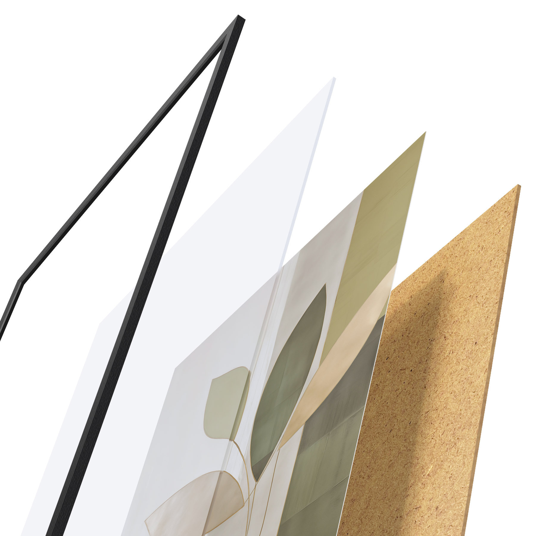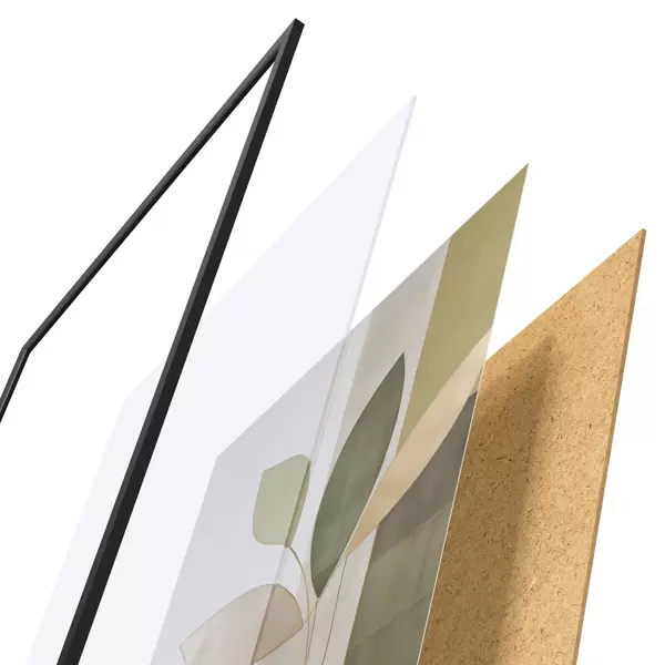 De poster bestaat uit een frame, plexiglas, geprinte afbeelding en spaanplaat achterkant. De poster kan meteen aan de muur worden gehangen dankzij de bevestigingen op de achterkant.