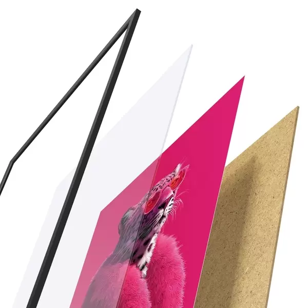 De poster bestaat uit een frame, plexiglas, geprinte afbeelding en spaanplaat achterkant. De poster kan meteen aan de muur worden gehangen dankzij de bevestigingen op de achterkant.