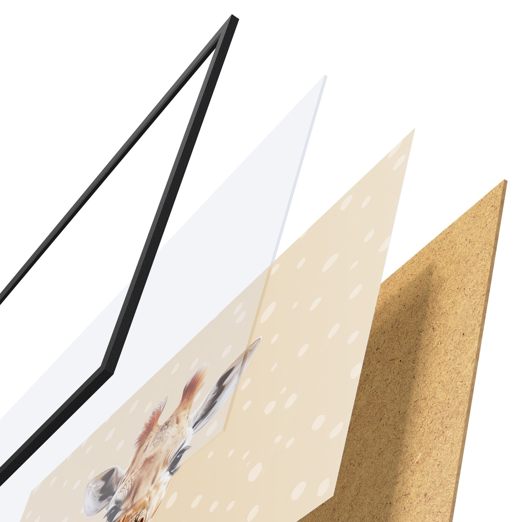 De poster bestaat uit een frame, plexiglas, geprinte afbeelding en spaanplaat achterkant. De poster kan meteen aan de muur worden gehangen dankzij de bevestigingen op de achterkant.