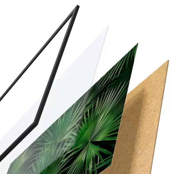 De poster bestaat uit een frame, plexiglas, geprinte afbeelding en spaanplaat achterkant. De poster kan meteen aan de muur worden gehangen dankzij de bevestigingen op de achterkant.