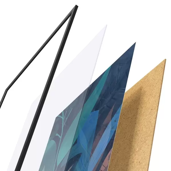 De poster bestaat uit een frame, plexiglas, geprinte afbeelding en spaanplaat achterkant. De poster kan meteen aan de muur worden gehangen dankzij de bevestigingen op de achterkant.