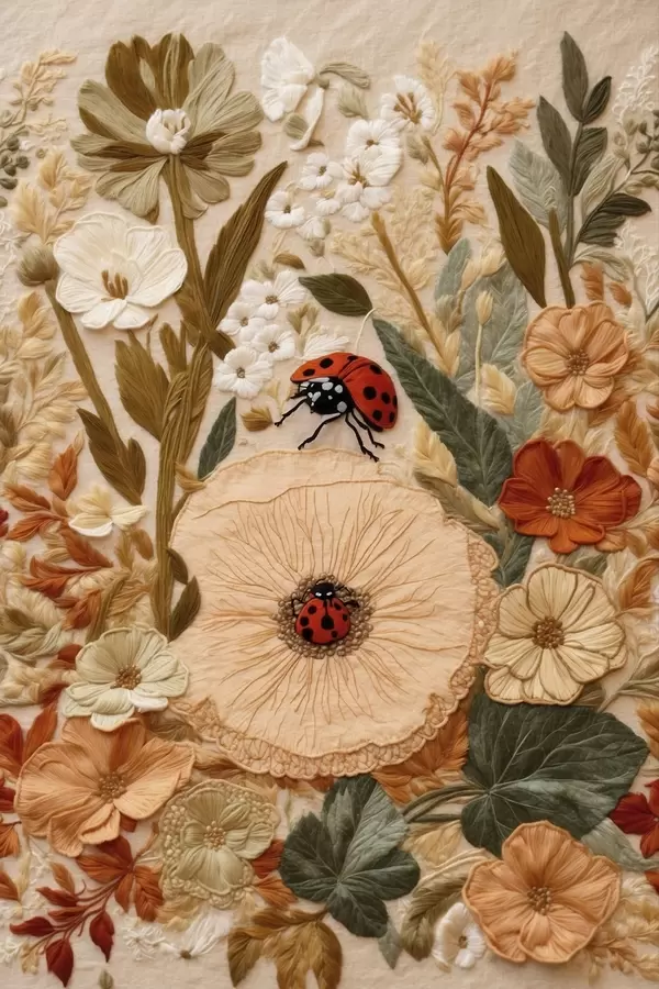 Poster Twee lieveheersbeestjes tussen zachte bloemen Nr f47758