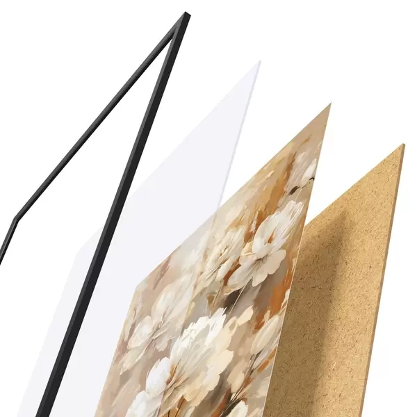 De poster bestaat uit een frame, plexiglas, geprinte afbeelding en spaanplaat achterkant. De poster kan meteen aan de muur worden gehangen dankzij de bevestigingen op de achterkant.