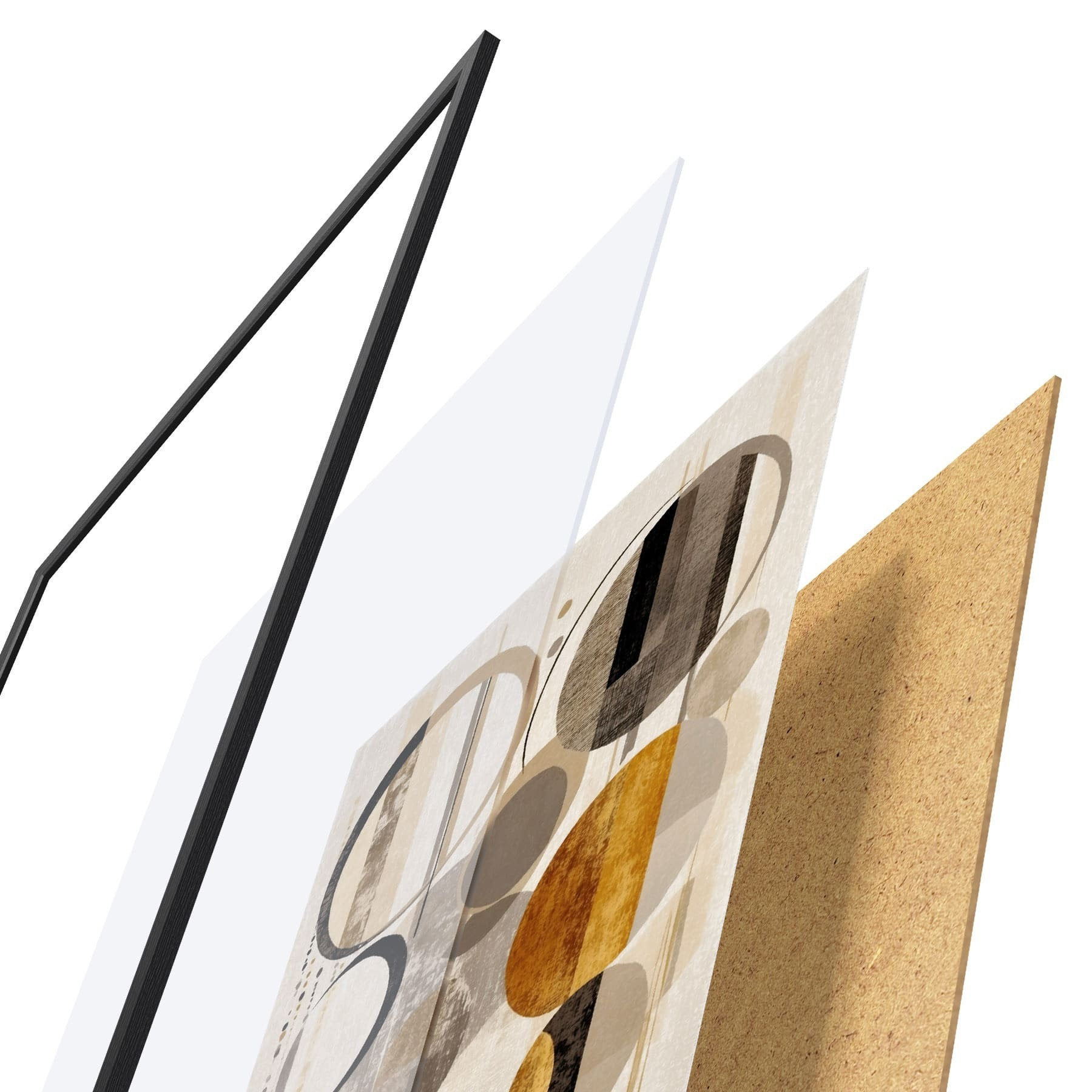 De poster bestaat uit een frame, plexiglas, geprinte afbeelding en spaanplaat achterkant. De poster kan meteen aan de muur worden gehangen dankzij de bevestigingen op de achterkant.