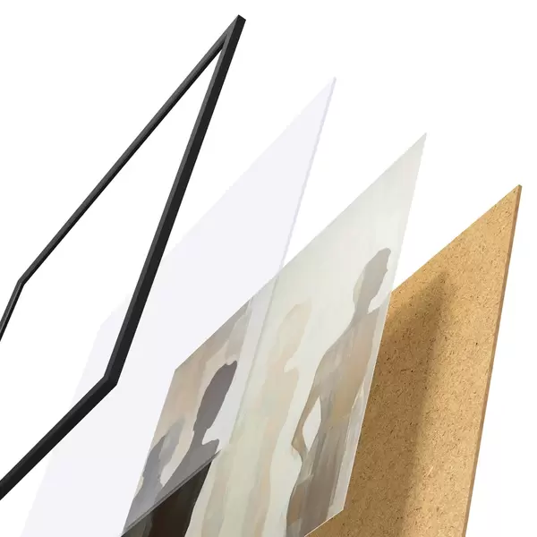 De poster bestaat uit een frame, plexiglas, geprinte afbeelding en spaanplaat achterkant. De poster kan meteen aan de muur worden gehangen dankzij de bevestigingen op de achterkant.