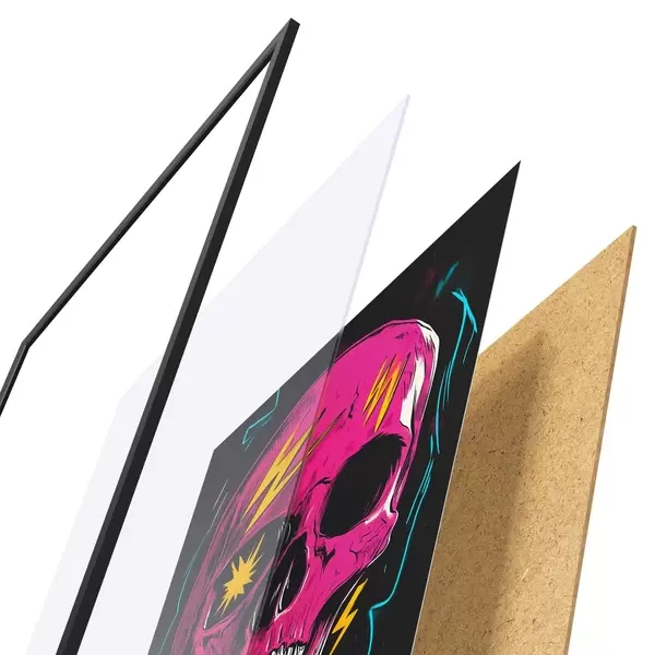 De poster bestaat uit een frame, plexiglas, geprinte afbeelding en spaanplaat achterkant. De poster kan meteen aan de muur worden gehangen dankzij de bevestigingen op de achterkant.