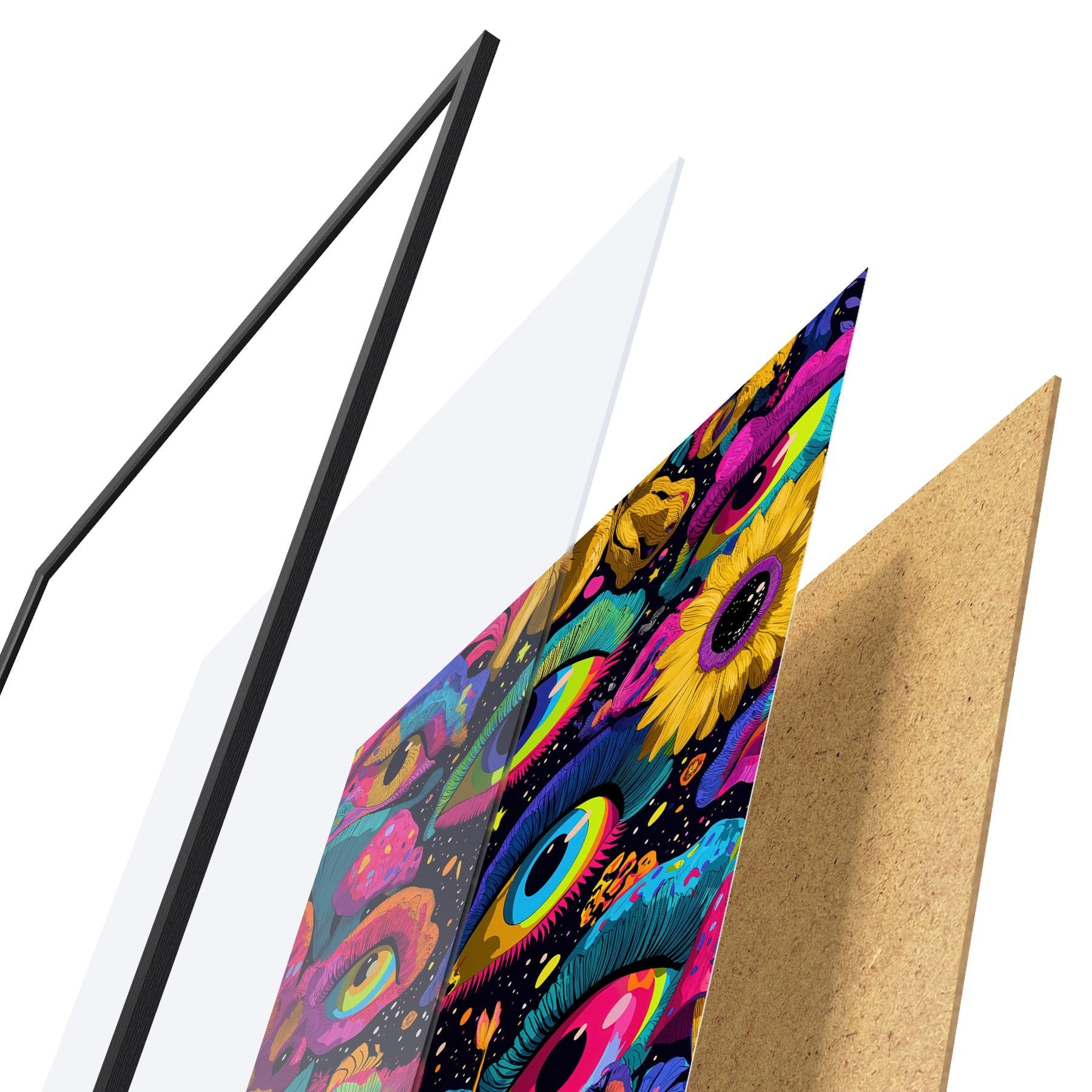De poster bestaat uit een frame, plexiglas, geprinte afbeelding en spaanplaat achterkant. De poster kan meteen aan de muur worden gehangen dankzij de bevestigingen op de achterkant.