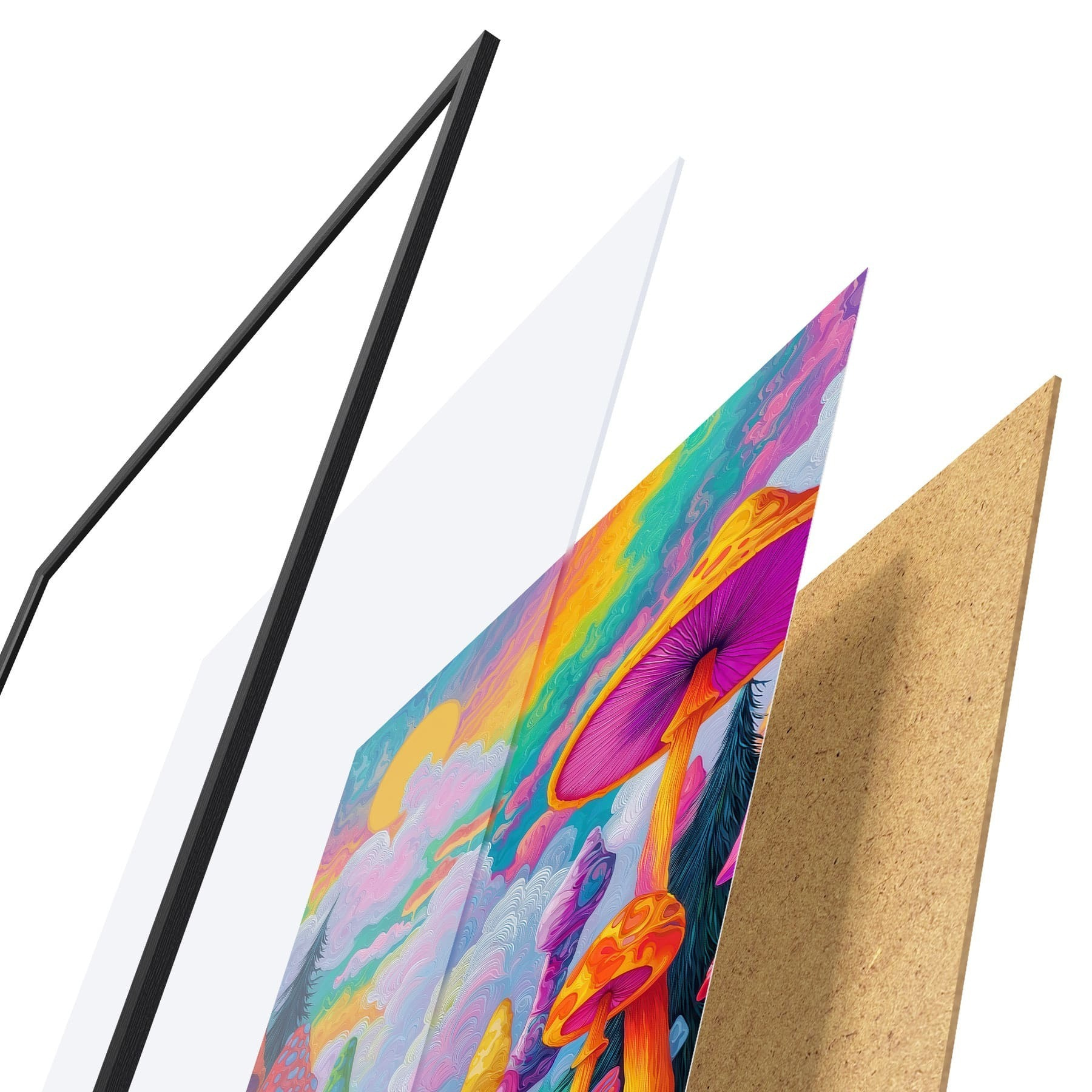 De poster bestaat uit een frame, plexiglas, geprinte afbeelding en spaanplaat achterkant. De poster kan meteen aan de muur worden gehangen dankzij de bevestigingen op de achterkant.