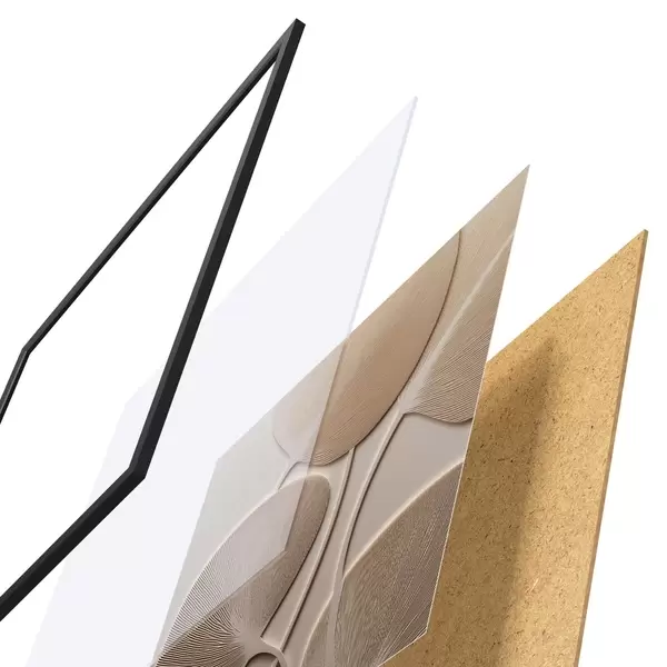 De poster bestaat uit een frame, plexiglas, geprinte afbeelding en spaanplaat achterkant. De poster kan meteen aan de muur worden gehangen dankzij de bevestigingen op de achterkant.