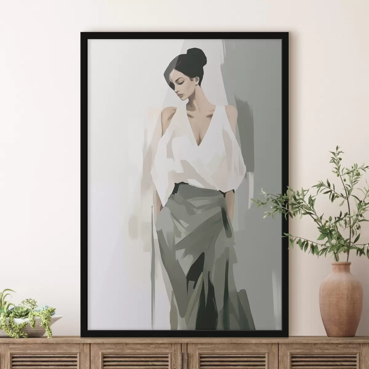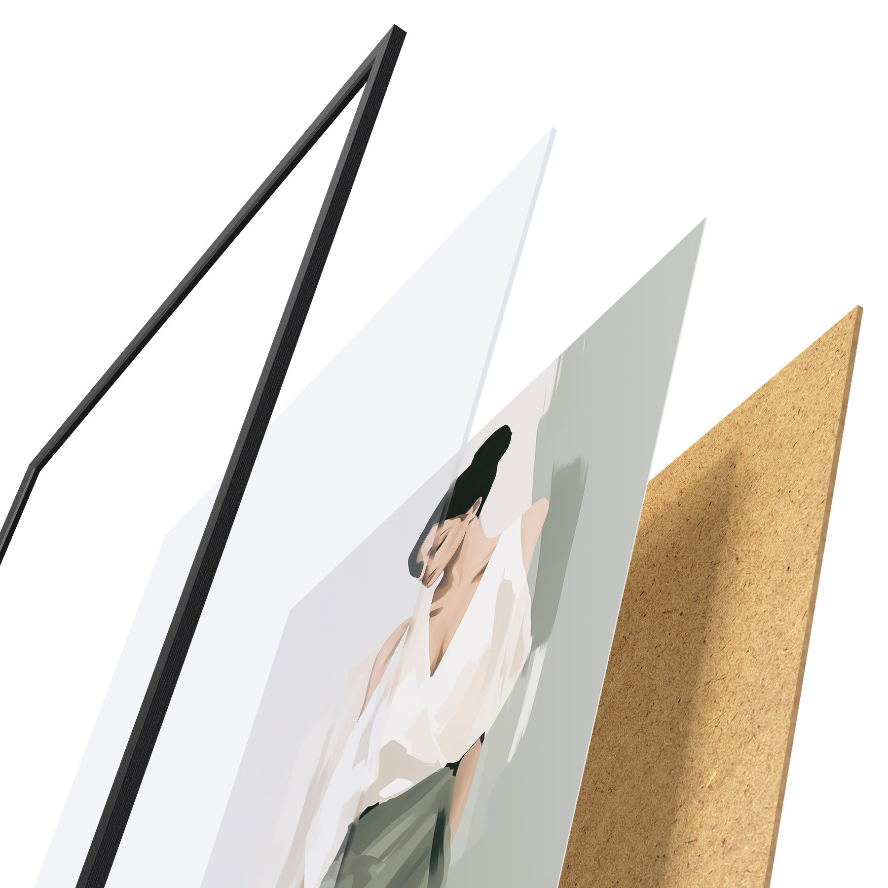 De poster bestaat uit een frame, plexiglas, geprinte afbeelding en spaanplaat achterkant. De poster kan meteen aan de muur worden gehangen dankzij de bevestigingen op de achterkant.