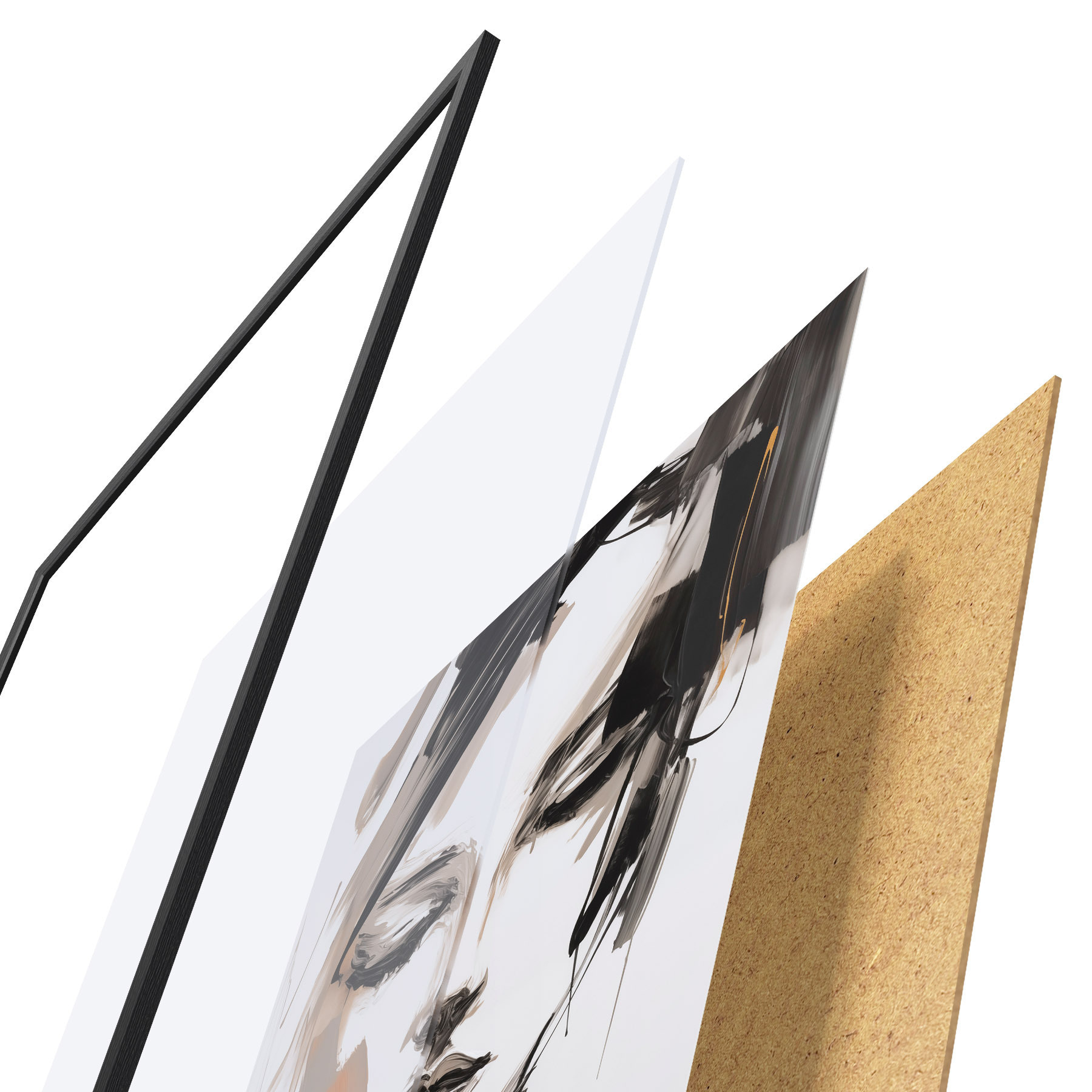 De poster bestaat uit een frame, plexiglas, geprinte afbeelding en spaanplaat achterkant. De poster kan meteen aan de muur worden gehangen dankzij de bevestigingen op de achterkant.