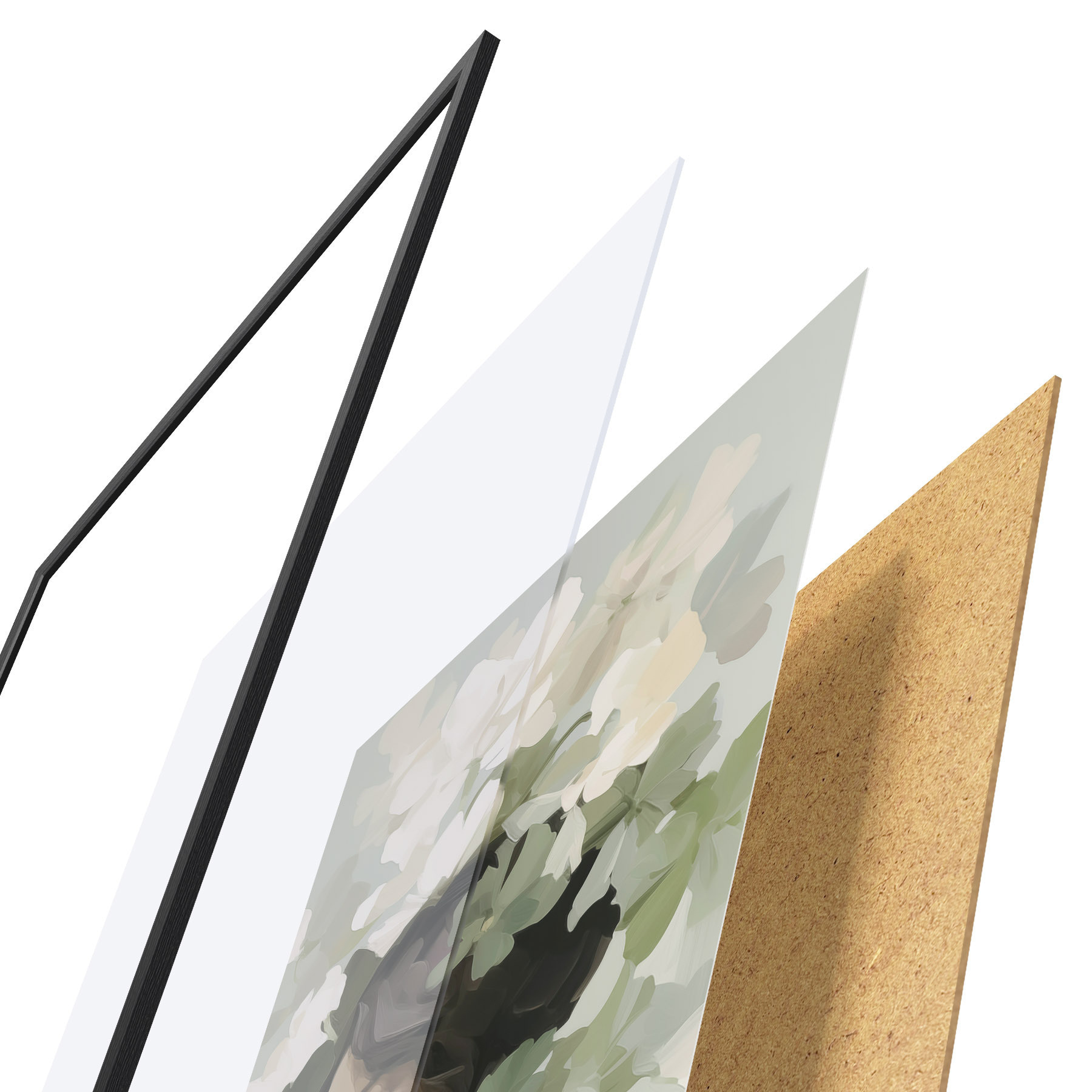De poster bestaat uit een frame, plexiglas, geprinte afbeelding en spaanplaat achterkant. De poster kan meteen aan de muur worden gehangen dankzij de bevestigingen op de achterkant.