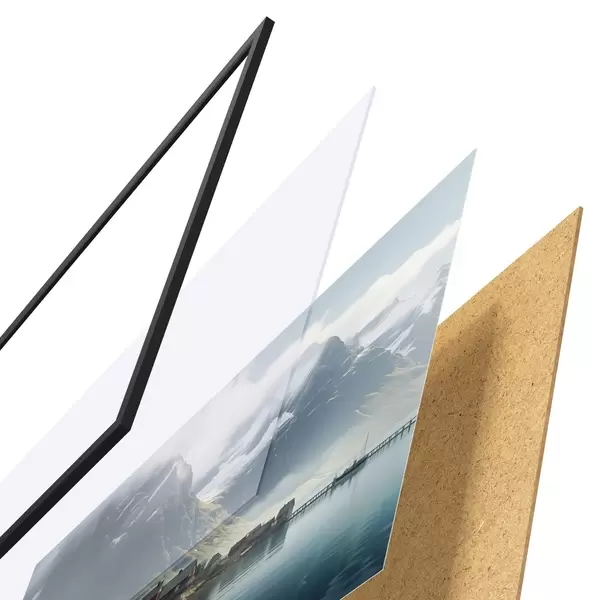 De poster bestaat uit een frame, plexiglas, geprinte afbeelding en spaanplaat achterkant. De poster kan meteen aan de muur worden gehangen dankzij de bevestigingen op de achterkant.