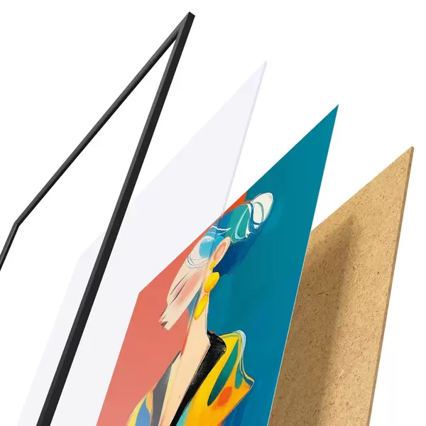 De poster bestaat uit een frame, plexiglas, geprinte afbeelding en spaanplaat achterkant. De poster kan meteen aan de muur worden gehangen dankzij de bevestigingen op de achterkant.