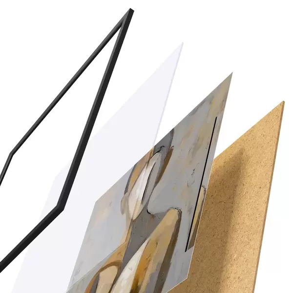 De poster bestaat uit een frame, plexiglas, geprinte afbeelding en spaanplaat achterkant. De poster kan meteen aan de muur worden gehangen dankzij de bevestigingen op de achterkant.