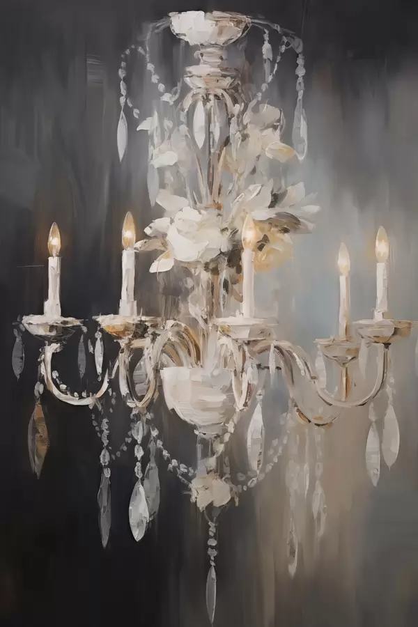 Poster Abstracte sierlijke kroonluchter met brandende kaarsen en bloemenaccenten, tegen een donkere, gestructureerde achtergrond Nr f47857