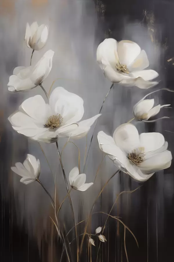 Poster Witte bloemen met bruine hartjes en dunne stelen tegen een donkere, gestructureerde achtergrond Nr f47858