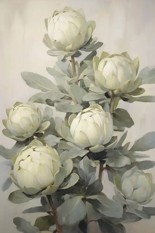 Poster Schilderstijl van verschillende witte proteabloemen met grote groene bladeren tegen een lichte achtergrond Nr f47861