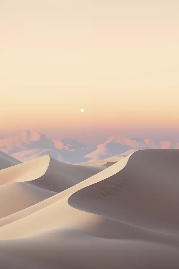 Poster Een woestijnlandschap met glooiende zandduinen onder een zachte pastelkleurige lucht, met in de verte bergen op de achtergrond. Nr f47865