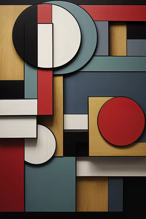 Poster Abstracte geometrische compositie met imitatie van houtstructuur, rode, zwarte, witte en blauwgroene rechthoeken en cirkels Nr f47875