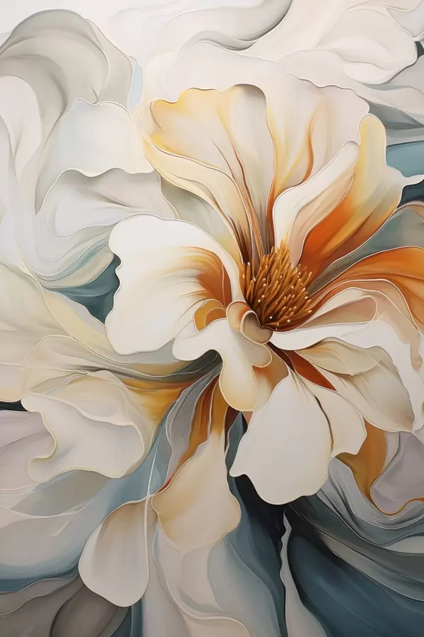 Poster Abstracte grote bloem met witte, oranje en blauwgroene bloemblaadjes, gestructureerde achtergrond Nr f47877