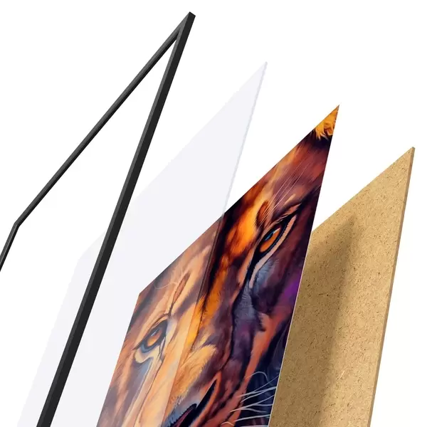De poster bestaat uit een frame, plexiglas, geprinte afbeelding en spaanplaat achterkant. De poster kan meteen aan de muur worden gehangen dankzij de bevestigingen op de achterkant.