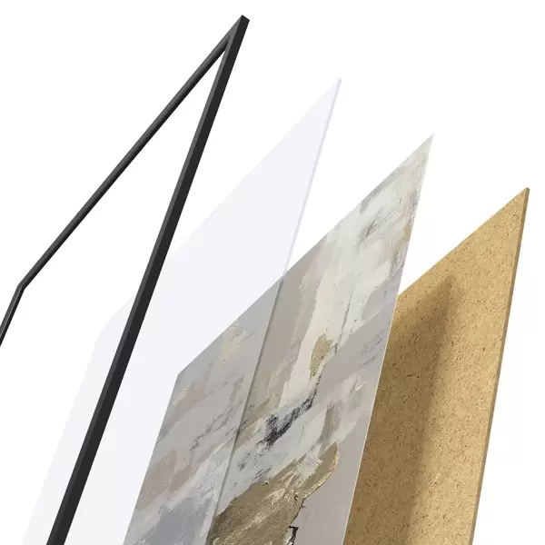 De poster bestaat uit een frame, plexiglas, geprinte afbeelding en spaanplaat achterkant. De poster kan meteen aan de muur worden gehangen dankzij de bevestigingen op de achterkant.