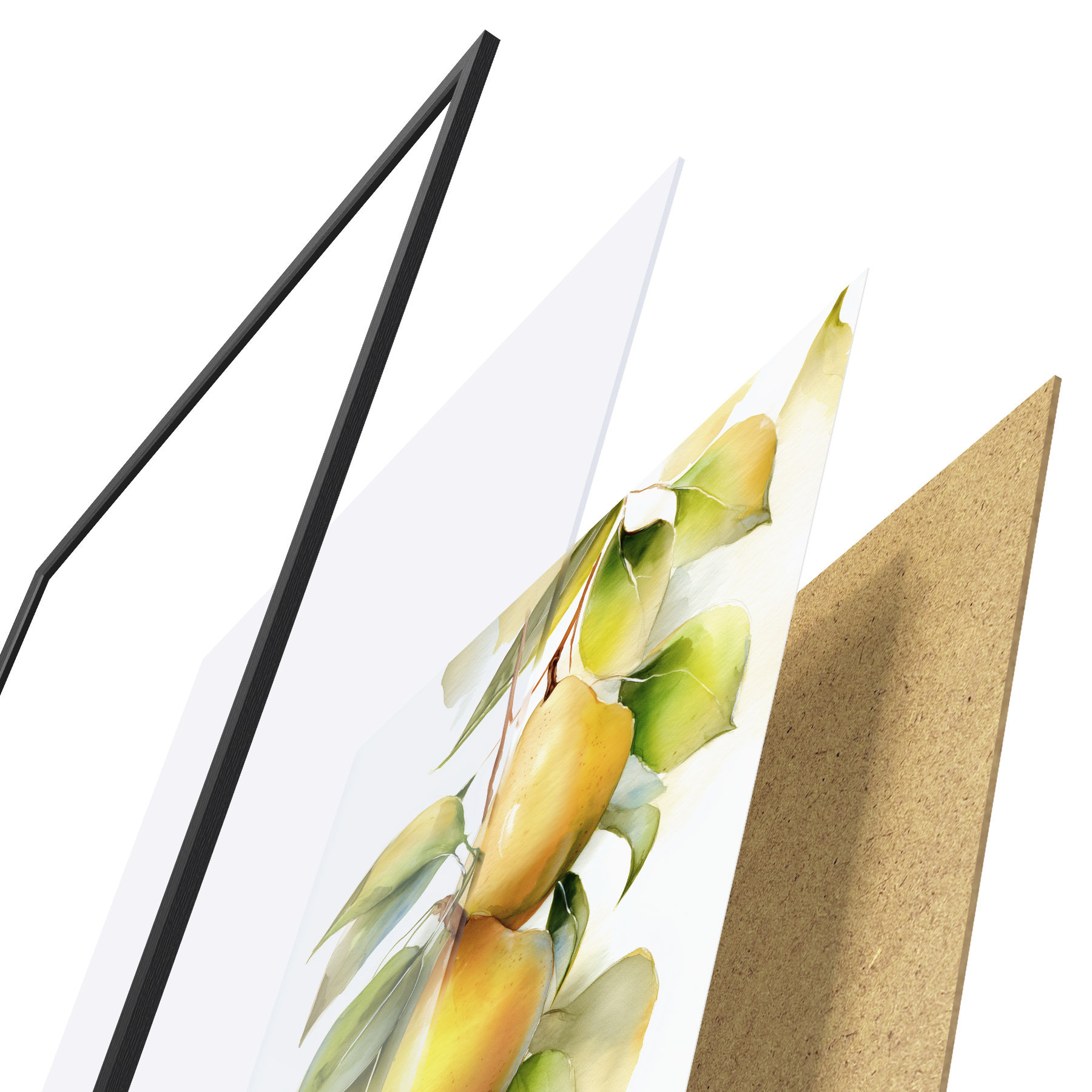 De poster bestaat uit een frame, plexiglas, geprinte afbeelding en spaanplaat achterkant. De poster kan meteen aan de muur worden gehangen dankzij de bevestigingen op de achterkant.