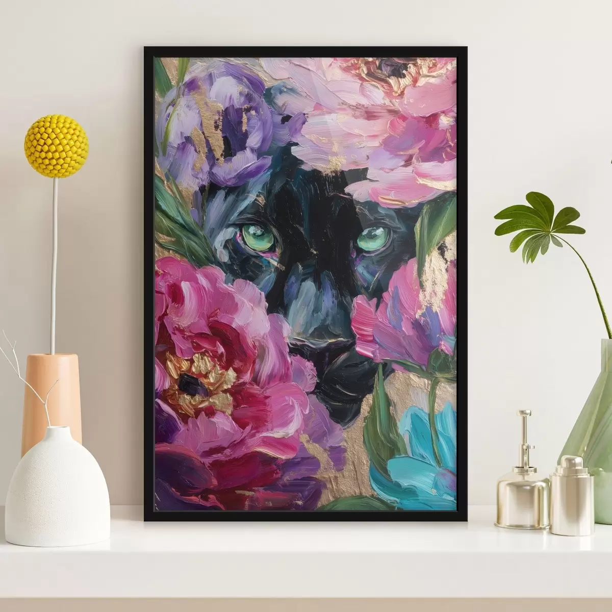 Poster een zwarte panter gluurt tussen de pioenrozen f47936