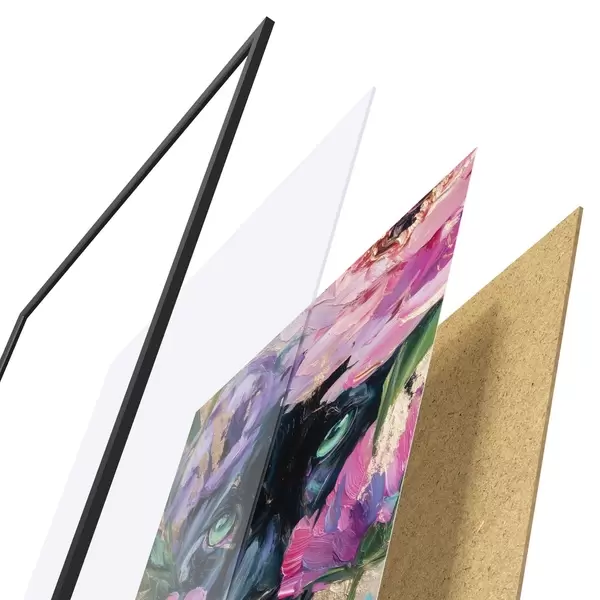 De poster bestaat uit een frame, plexiglas, geprinte afbeelding en spaanplaat achterkant. De poster kan meteen aan de muur worden gehangen dankzij de bevestigingen op de achterkant.