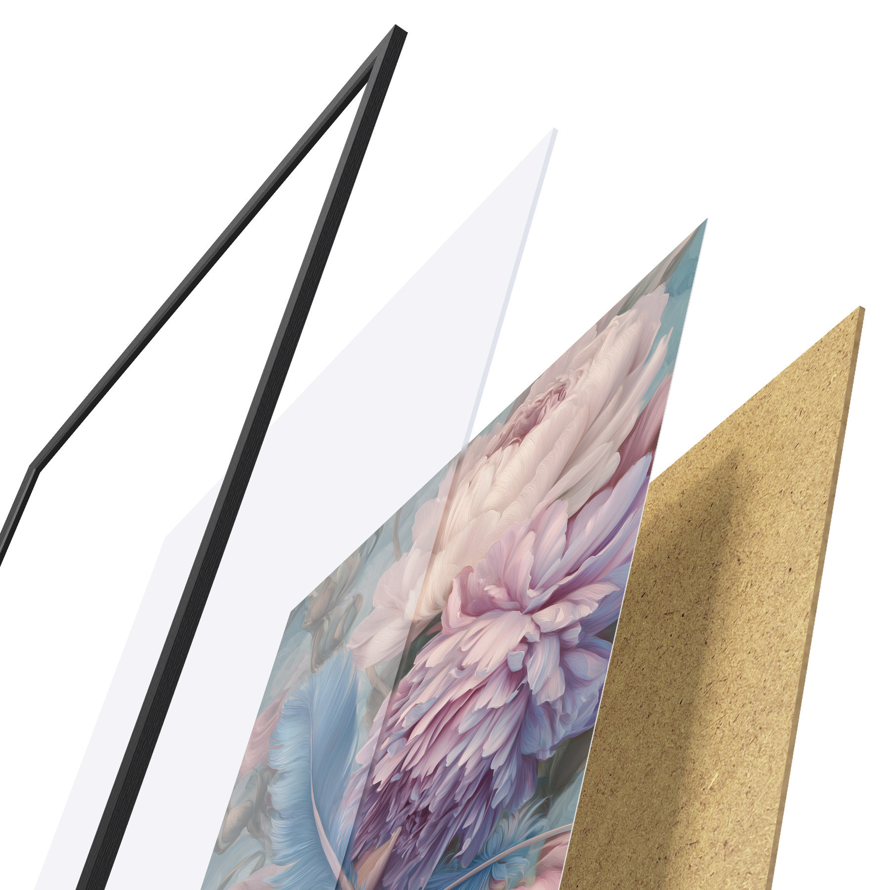 De poster bestaat uit een frame, plexiglas, geprinte afbeelding en spaanplaat achterkant. De poster kan meteen aan de muur worden gehangen dankzij de bevestigingen op de achterkant.