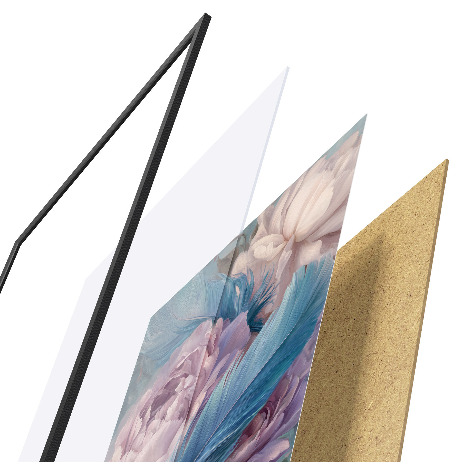 De poster bestaat uit een frame, plexiglas, geprinte afbeelding en spaanplaat achterkant. De poster kan meteen aan de muur worden gehangen dankzij de bevestigingen op de achterkant.