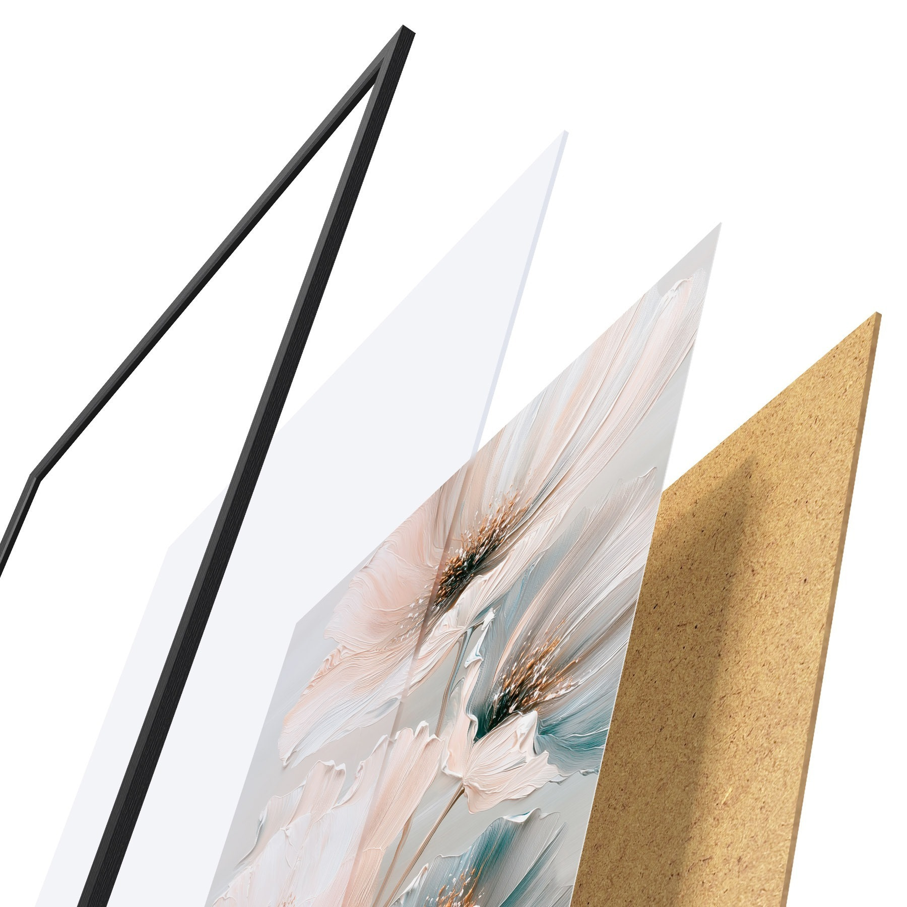 De poster bestaat uit een frame, plexiglas, geprinte afbeelding en spaanplaat achterkant. De poster kan meteen aan de muur worden gehangen dankzij de bevestigingen op de achterkant.