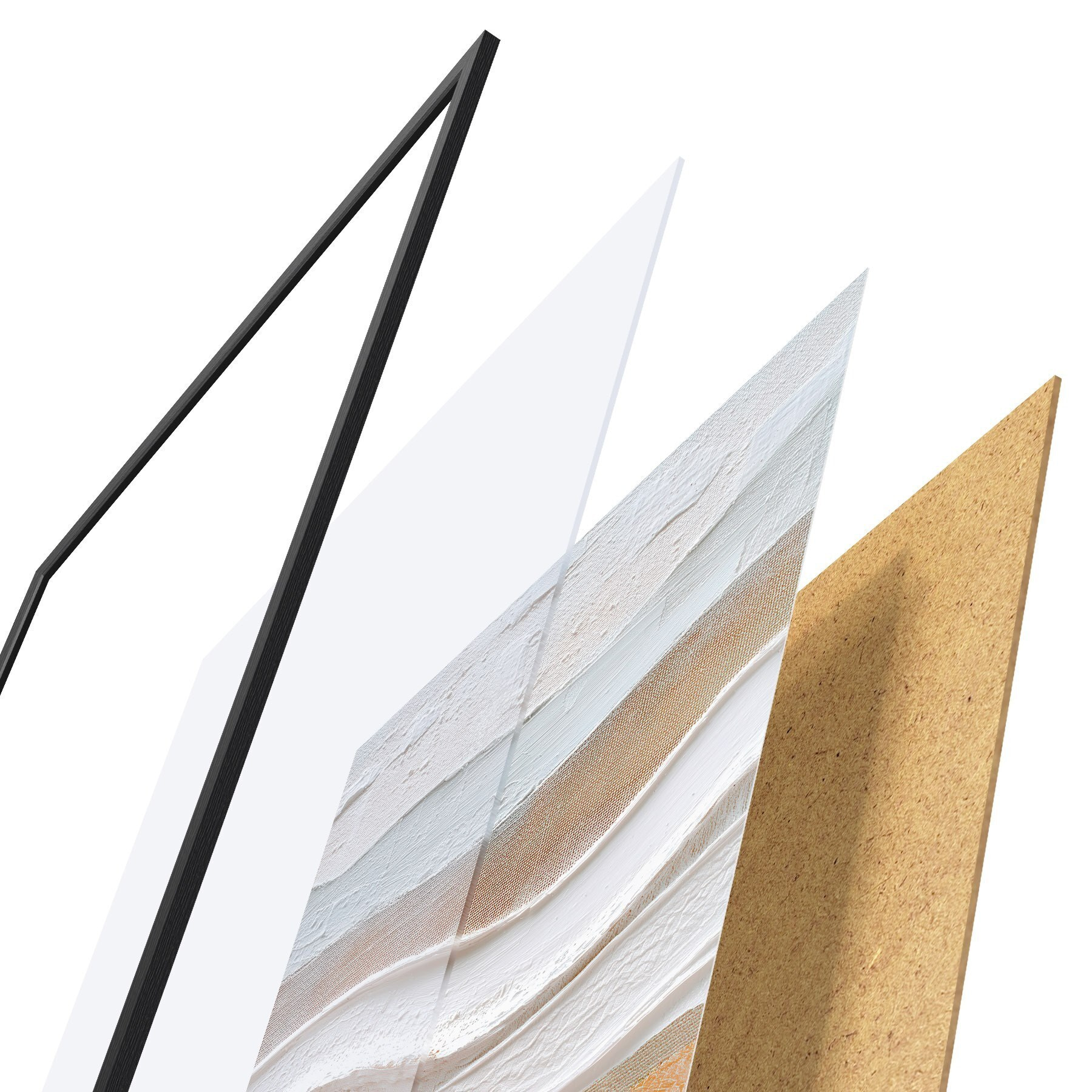 De poster bestaat uit een frame, plexiglas, geprinte afbeelding en spaanplaat achterkant. De poster kan meteen aan de muur worden gehangen dankzij de bevestigingen op de achterkant.