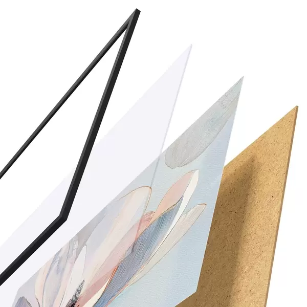 De poster bestaat uit een frame, plexiglas, geprinte afbeelding en spaanplaat achterkant. De poster kan meteen aan de muur worden gehangen dankzij de bevestigingen op de achterkant.
