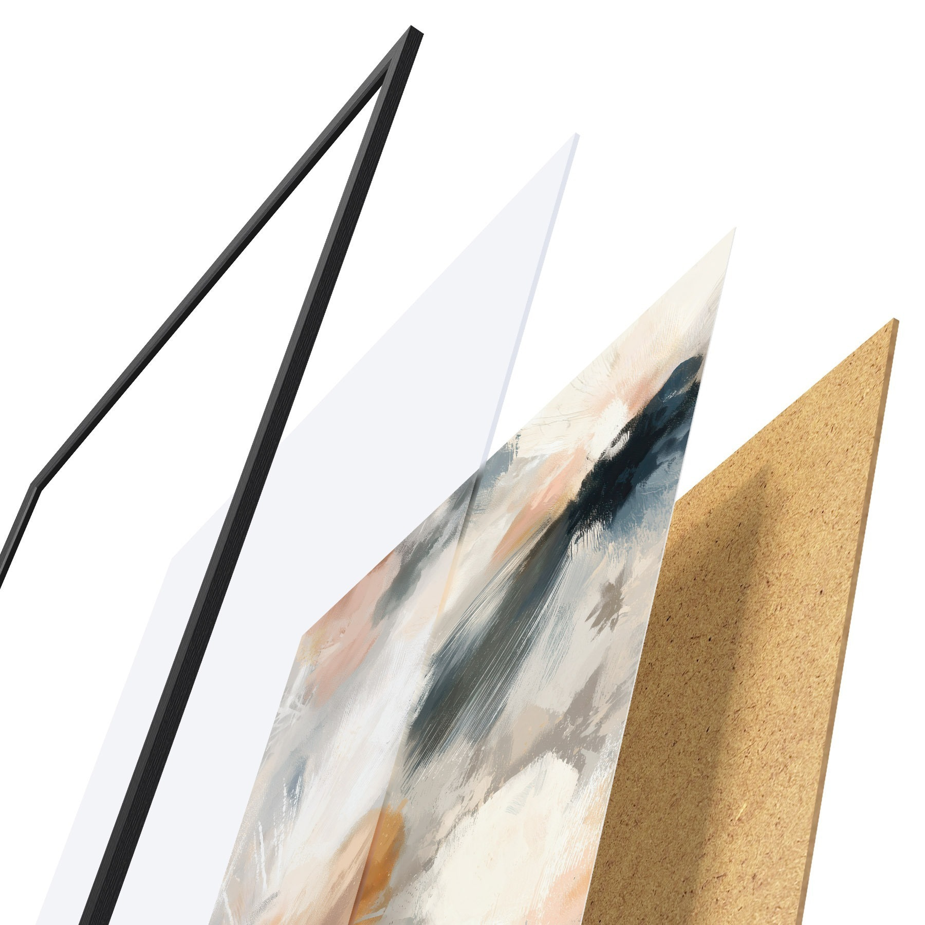 De poster bestaat uit een frame, plexiglas, geprinte afbeelding en spaanplaat achterkant. De poster kan meteen aan de muur worden gehangen dankzij de bevestigingen op de achterkant.