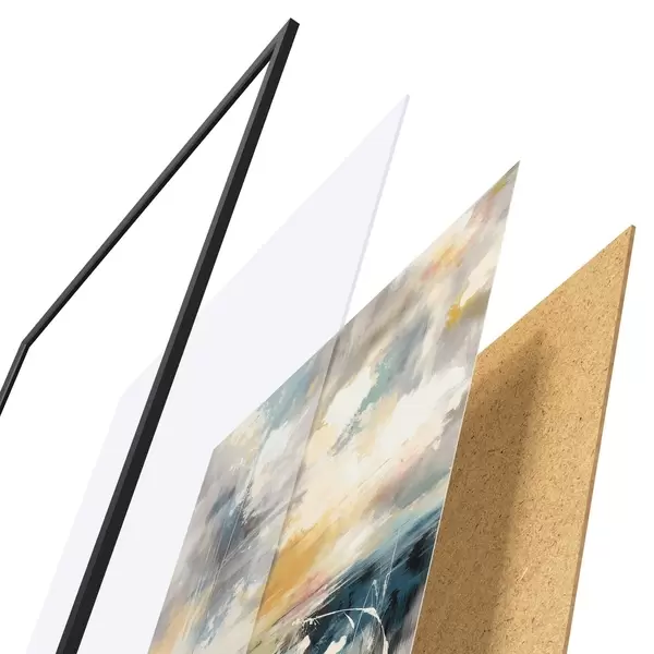 De poster bestaat uit een frame, plexiglas, geprinte afbeelding en spaanplaat achterkant. De poster kan meteen aan de muur worden gehangen dankzij de bevestigingen op de achterkant.