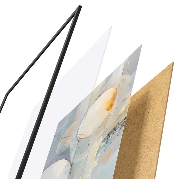 De poster bestaat uit een frame, plexiglas, geprinte afbeelding en spaanplaat achterkant. De poster kan meteen aan de muur worden gehangen dankzij de bevestigingen op de achterkant.
