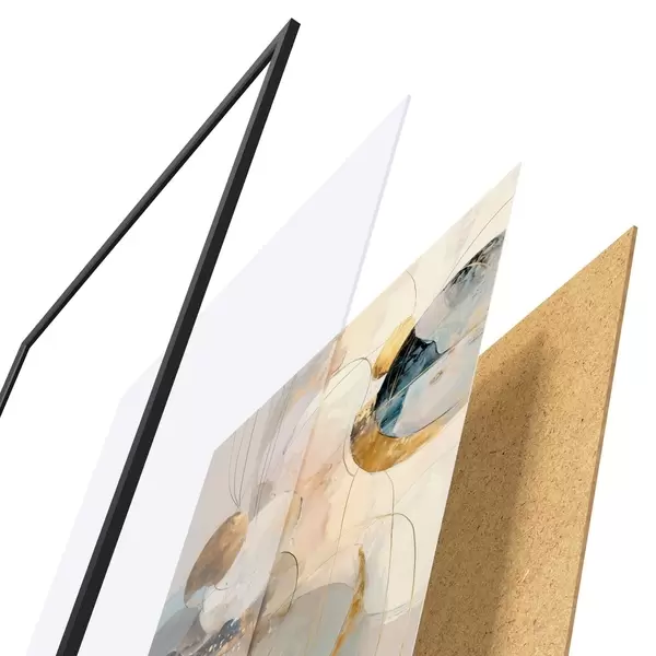 De poster bestaat uit een frame, plexiglas, geprinte afbeelding en spaanplaat achterkant. De poster kan meteen aan de muur worden gehangen dankzij de bevestigingen op de achterkant.