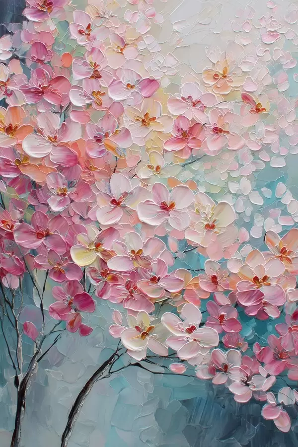 Poster Tak met roze bloemen op een blauwe achtergrond in olieverfstijl Nr f47987
