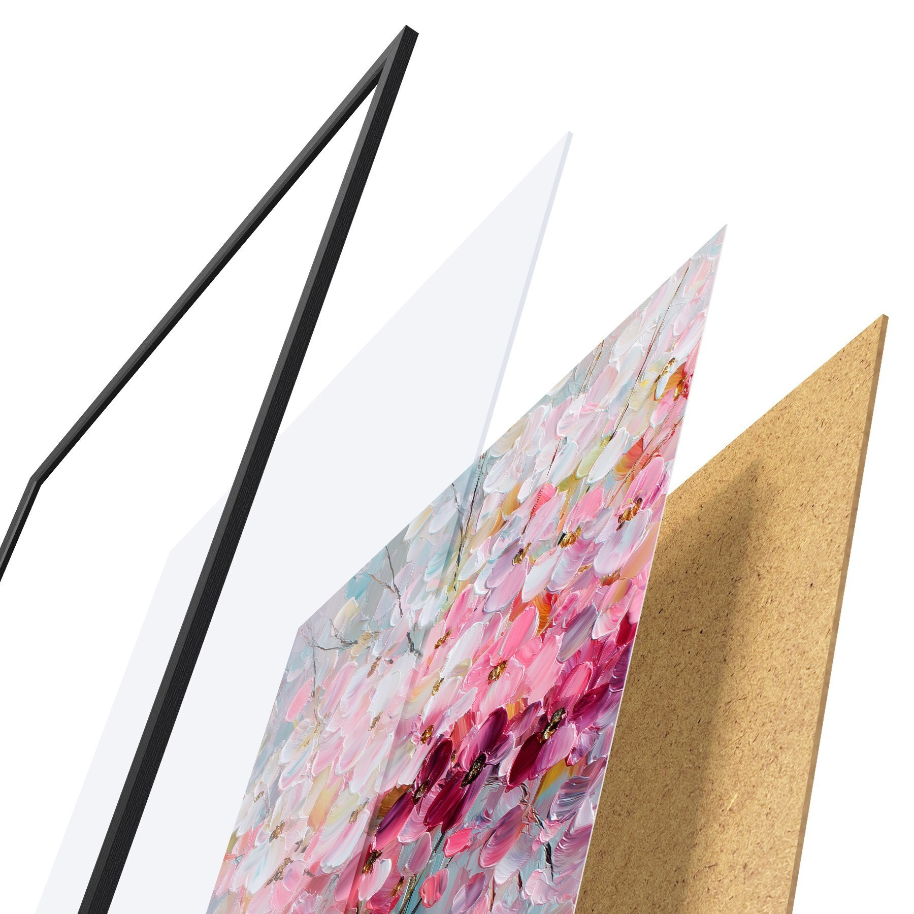 De poster bestaat uit een frame, plexiglas, geprinte afbeelding en spaanplaat achterkant. De poster kan meteen aan de muur worden gehangen dankzij de bevestigingen op de achterkant.