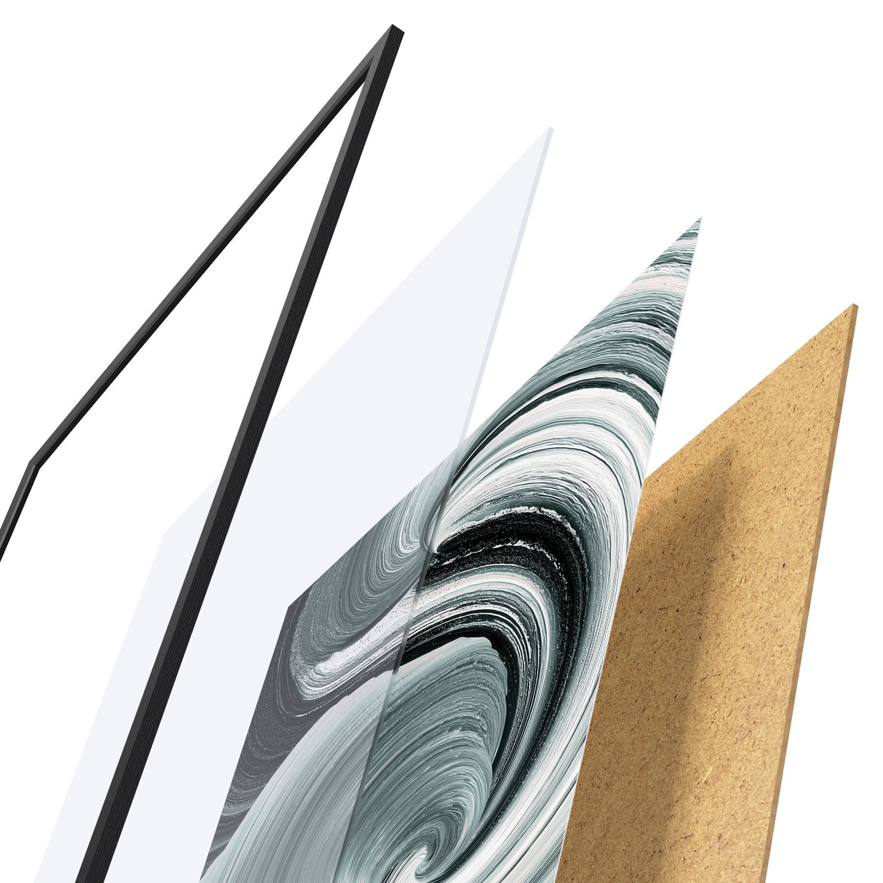 De poster bestaat uit een frame, plexiglas, geprinte afbeelding en spaanplaat achterkant. De poster kan meteen aan de muur worden gehangen dankzij de bevestigingen op de achterkant.
