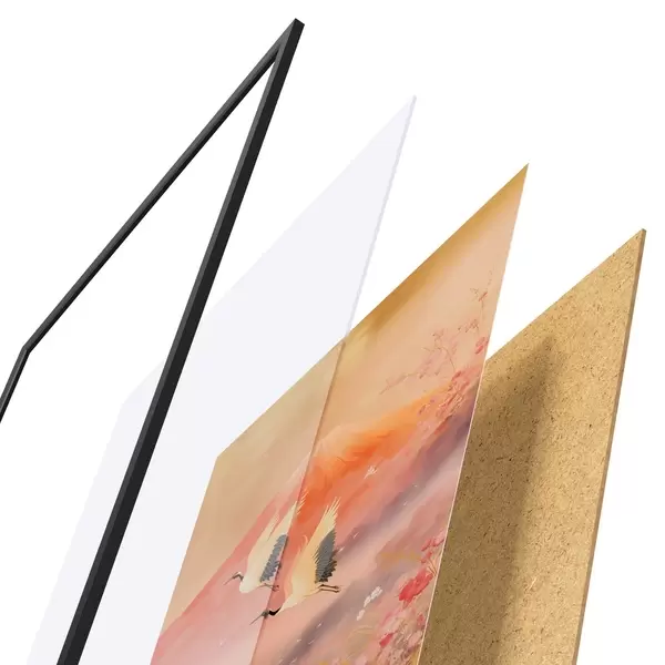 De poster bestaat uit een frame, plexiglas, geprinte afbeelding en spaanplaat achterkant. De poster kan meteen aan de muur worden gehangen dankzij de bevestigingen op de achterkant.