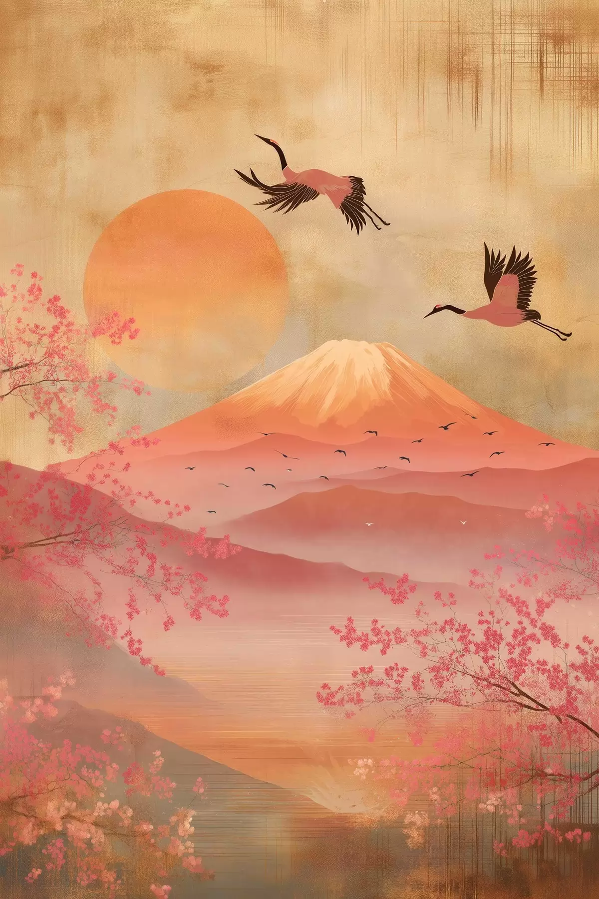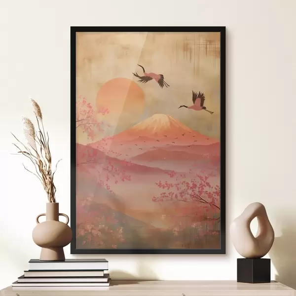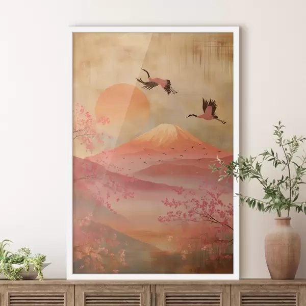 Poster Kranen tegen de zon en bergen: illustratie in digitale kunststijl Nr f47992