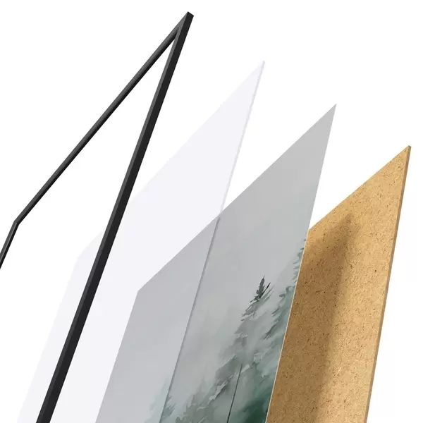 De poster bestaat uit een frame, plexiglas, geprinte afbeelding en spaanplaat achterkant. De poster kan meteen aan de muur worden gehangen dankzij de bevestigingen op de achterkant.