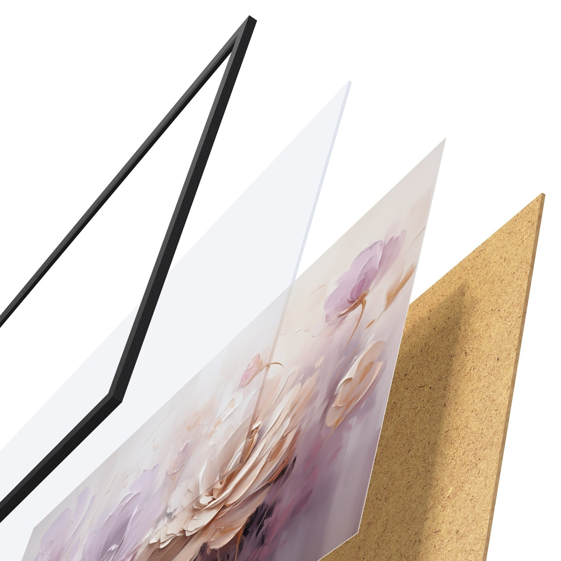 De poster bestaat uit een frame, plexiglas, geprinte afbeelding en spaanplaat achterkant. De poster kan meteen aan de muur worden gehangen dankzij de bevestigingen op de achterkant.