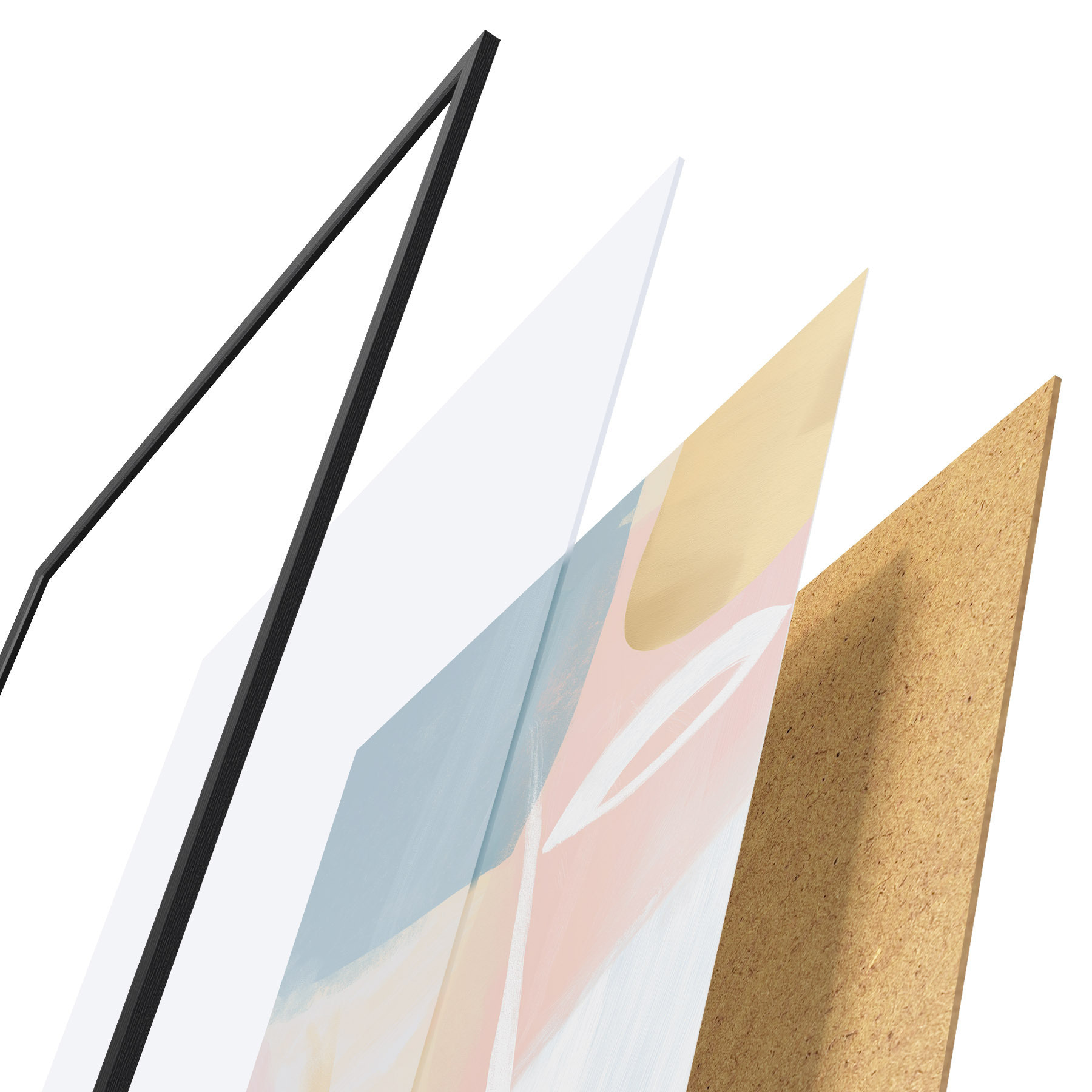 De poster bestaat uit een frame, plexiglas, geprinte afbeelding en spaanplaat achterkant. De poster kan meteen aan de muur worden gehangen dankzij de bevestigingen op de achterkant.