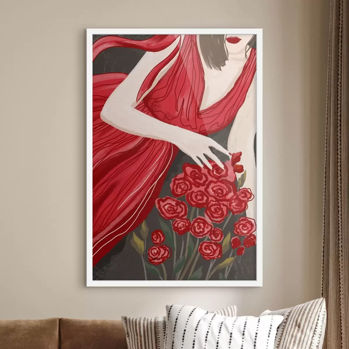 Poster Vrouw in rode jurk met rozenboeket Nr f48026